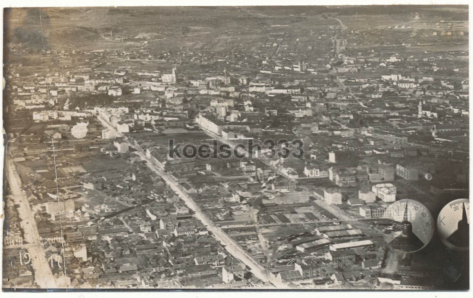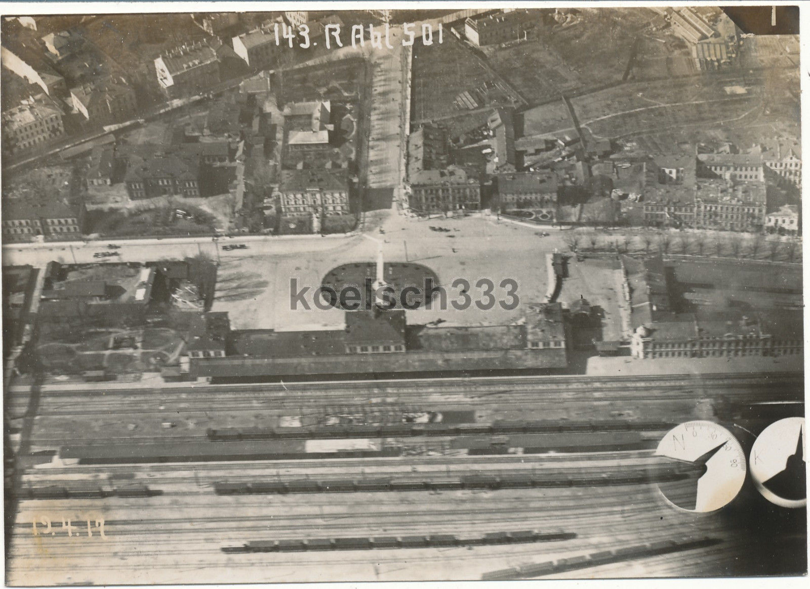 Žvalgybinė Vokietijos imperijos karinių oro pajėgų 501 didžiųjų orlaivių dalinio (Riesenflieger Abt. Nr. 501) žvalgybinė fotografija. Puikiai matomas neišlikęs, tuomet nelyginės numeracijos, Geležinkelio gatvės užstatymas. Po šimtmečio, kažkur tarp šių namų stovės McDonald's, kitoje Stoties g. pusėje erdvė ištuštės autobusų stoties prieigoms. Vaizde matome šiandien neįprastos konfigūracijos geležinkelio stoties aikštę, senąjį pėsčiųjų tiltą per gelžkelį ir neišlikusį Vilniaus geležinkelio stoties pastatą. Peronuose – net du pajudėjimo laukiantys lokomotyvai.